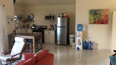 I went with a totally different pattern but equally colorful fabric for the other room, keeping to the turquoise/teal and orange colors. Over the Christmas break, Thomas and I were furiously (well, Thomas more furiously than I) working to get the casa ready for our first long term renters. This is a canadian couple who are checking out Cabrera just as we did a couple years ago. I hope they are comfortable and will soon love it as we do. As my husband says "How can anyone NOT love it here?" I disagree, of course, there are lots of totally crazy people out there who would scoff at tropical landscapes and weather. To each their own. I finally got rid of the clunky-constantly-in-the-way closet doors some of which would not stay closed and others were forever locked. I replaced them with IKEA panel curtains that slide on a track and I find them much more attractive and the added benefit is that they allow air to circulate and mitigate mildew due to humidity. (As many of you have probably also experienced...unpack your 'dry' clothes back home in Michigan and they come out damp! Gum has to be the hard-coated kind or you will have gelatinous goo wrapped in sticky wax paper. Pills and medicine need to be capsules for the same reason...but you will use way less lotion! There's always a trade off!) We have started getting some art up on the walls and added a bath vanity (also from IKEA) to finally have somewhere to keep toiletries. I'm still trying to find the elusive end tables but, I did find some all wood foldable tables and Thomas picked up some Hemnes bedside tables from...yup...you guessed it IKEA. I swear I don't get any kick backs from them...it's just that the house is built in a contemporary tropical style and I'm tryinig to keep to that. We have ceiling fans in all the bedrooms, including the separate unit which now has a bed and sink added to the pre-existing empty room with a toilet and shower. Thomas will be sleeping there tonight for the first time...still a far better set up than his very first night with no power, water, and only a mattress on the floor. Thomas also hung some lights in the kitchen that run along two wires...looks pretty cool. There are still MANY projects left. Little cosmetic finishes. But, in two years of random weeks spent working on the house, it's finally ready for a test run. Our hope is that people who stay there will want to come back on a regular basis and we will not have to put it up on any rental sites. We hope it will provide some income to pay for the gradual updates and expansions we'd like to do. It is currently a cost free house. With just